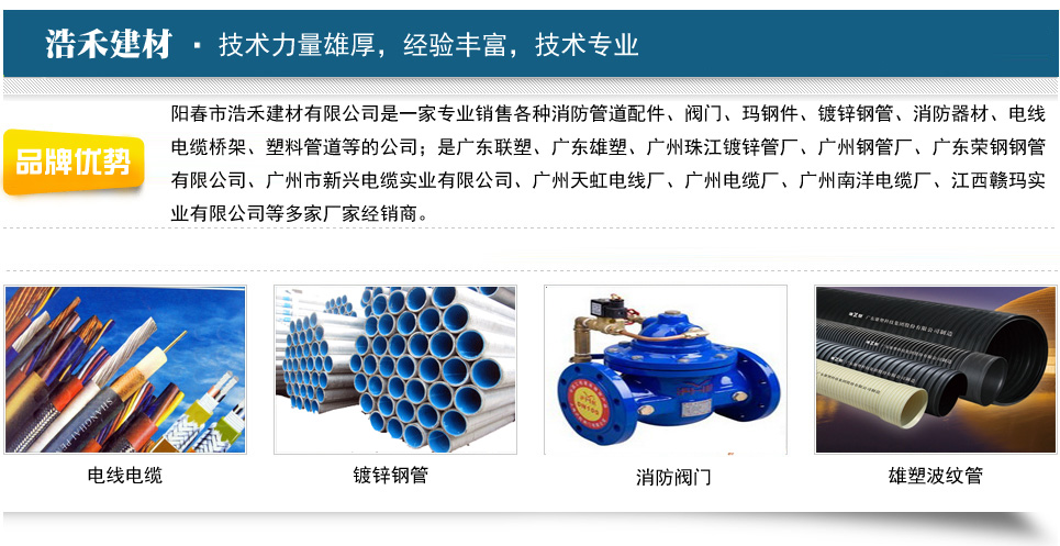 陽(yáng)春市浩禾建材有限公司是一家專(zhuān)業(yè)銷(xiāo)售各種消防管道配件、閥門(mén)、瑪鋼件、鍍鋅鋼管、消防器材、電線(xiàn)電纜橋架、塑料管道等的公司;是廣東聯(lián)塑、廣東雄塑、廣州珠江鍍鋅管廠(chǎng)、廣州鋼管廠(chǎng)、廣東榮鋼鋼管有限公司、廣州市新興電纜實(shí)業(yè)有限公司、廣州天虹電線(xiàn)廠(chǎng)、廣州電纜廠(chǎng)、廣州南洋電纜廠(chǎng)、江西贛瑪實(shí)業(yè)有限公司等多家廠(chǎng)家經(jīng)銷(xiāo)商。